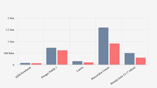 Vaksinasi ke petugas publik dengan target 694,48 ribu jiwa. Vaksinasi dosis 1 dilaporkan telah mencapai 726,48 ribu jiwa (104,61 persen target) dan dosis 2 dengan capaian 88,31 persen atau berhasil tersalurkan sebanyak 613,26 ribu jiwa.