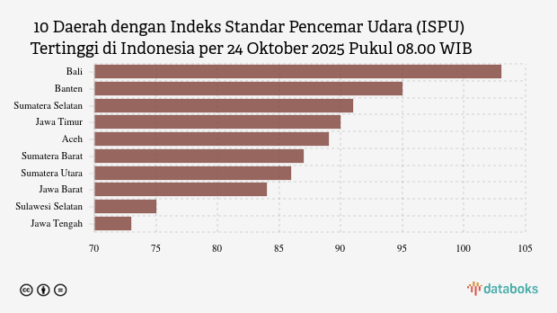 Kualitas Udara di Bali pagi ini terburuk di Indonesia. Berdasarkan halaman Indeks Standar Pencemar Udara (ISPU) Kementerian Lingkungan Hidup dan Kehutanan (KLHK) pada Jumat (24/10/2025) pukul 08.00 WIB terungkap bahwa indeks kualitas udara di Bali sebesar 103.