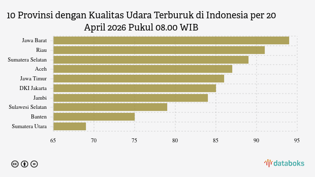 Berikut daftar 10 provinsi dengan indeks kualitas udara terburuk di Indonesia pada Senin, 20 April 2026 pukul 08.00 WIB.