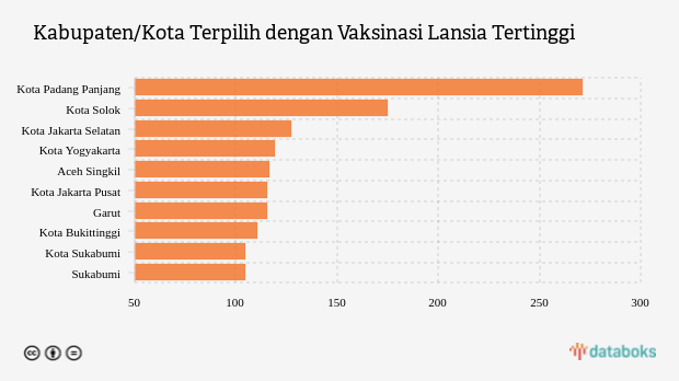 Vaksinasi lansia lima kabupaten/kota teratas dengan angka lebih dari 116,45 persen, yaitu kota Padang Panjang, kota Solok, kota Jakarta Selatan, kota Yogyakarta dan Aceh Singkil dengan masing-masing nilai 271,07 persen, 174,76 persen, 127,21 persen, 119,12 persen dan 116,45 persen.