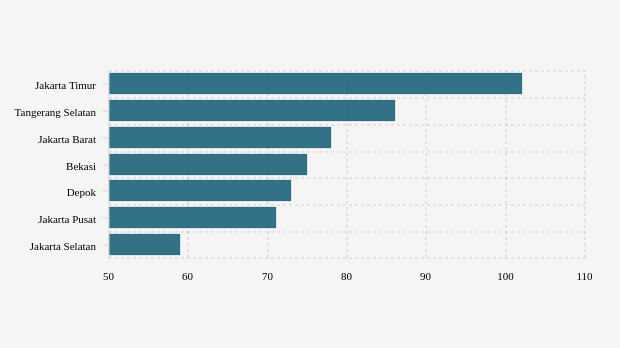 Di bawah kota Jakarta Timur, ada Tangerang Selatan di urutan kedua dengan indeks kualitas udara 86. Selanjutnya, Jakarta Barat menempati urutan ketiga dengan skor 78.