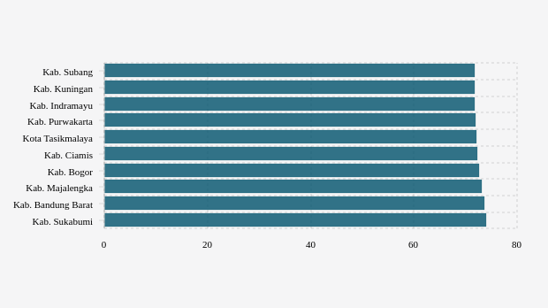 Menyusul berikutnya adalah kabupaten Kuningan. Untuk vaksinasi dosis 2, daerah ini masuk nomor dua terendah. Dengan sasaran vaksin sebanyak 922,96 ribu peserta, namun telah berhasil direalisasikan 71,83 persen atau 662,98 ribu peserta.