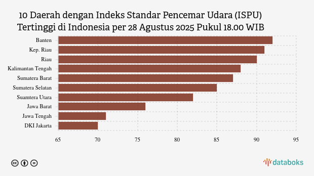 Berikut daftar 10 provinsi dengan indeks kualitas udara terburuk di Indonesia pada Kamis, 28 Agustus 2025 pukul 18.00 WIB.