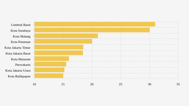 tracing lima kabupaten/kota teratas dengan angka lebih dari 18,54 persen, yaitu Lombok Barat, kota Surabaya, kota Malang, kota Pasuruan dan kota Jakarta Timur dengan masing-masing nilai 31 persen, 30 persen, 21 persen, 20 persen dan 18,54 persen.
