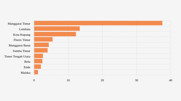 Manggarai timur adalah kabupaten di urutan pertama dengan BOR aglomerasi mingguan tertinggi sebesar 37,5 persen. Kondisi BOR aglomerasi mingguan di kabupaten ini memperlihatkan ada kemajuan dengan adanya penurunan dibandingkan pekan sebelumnya yang tercatat 37,5 persen.