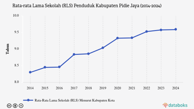 Rata-rata lama sekolah (RLS) penduduk berusia 25 tahun ke atas di Pidie Jaya, Aceh mencapai 9,59 tahun pada 2024.