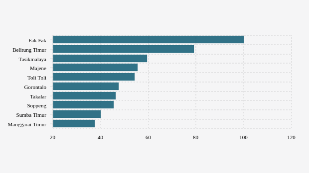 Wilayah di luar Jawa dengan nilai BOR tertinggi beberapa di antaranya adalah Fak Fak, Belitung Timur dan Majene dengan masing-masing BOR yakni 100 persen, 78,95 persen dan 55,36 persen.