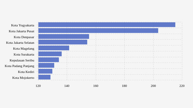 Vaksinasi lengkap lima kabupaten/kota teratas dengan angka lebih dari 141,37 persen, yaitu kota Yogyakarta, kota Jakarta Pusat, kota Denpasar, kota Jakarta Selatan dan kota Magelang dengan masing-masing nilai 215,32 persen, 203,35 persen, 155,26 persen, 154 persen dan 141,37 persen.