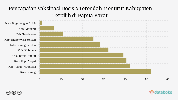 Sebagian wilayah kabupaten/kota di provinsi Papua Barat masih mencatatkan tingkat vaksinasi dosis 2 yang cukup rendah dibandingkan wilayah lainnya. Beberapa kabupaten/kota tersebut di antaranya kabupaten Pegunungan Arfak, kabupaten Maybrat dan kabupaten Tambrauw.