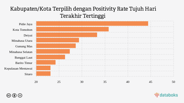 positivity rate tujuh hari terakhir lima kabupaten/kota teratas dengan angka lebih dari 28,57 persen, yaitu Pidie Jaya, kota Tomohon, Deiyai, Minahasa Utara dan Gunung Mas dengan masing-masing nilai 44,44 persen, 35,8 persen, 33,33 persen, 29,27 persen dan 28,57 persen.
