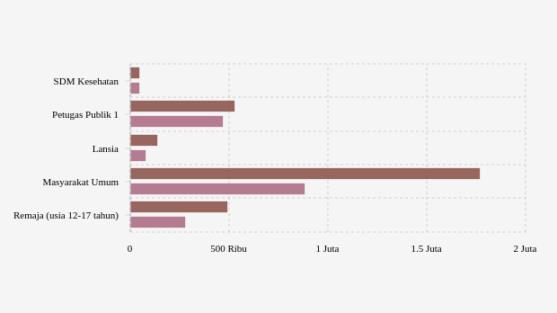 Vaksinasi ke petugas publik dengan target 349,42 ribu jiwa. Vaksinasi dosis 1 dilaporkan telah mencapai 526,36 ribu jiwa (150,64 persen target) dan dosis 2 dengan capaian 134,4 persen atau berhasil tersalurkan sebanyak 469,63 ribu jiwa.