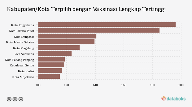 Vaksinasi lengkap lima kabupaten/kota teratas dengan angka lebih dari 128,88 persen, yaitu kota Yogyakarta, kota Jakarta Pusat, kota Denpasar, kota Jakarta Selatan dan kota Magelang dengan masing-masing nilai 196,08 persen, 184,85 persen, 140,73 persen, 139,43 persen dan 128,88 persen.