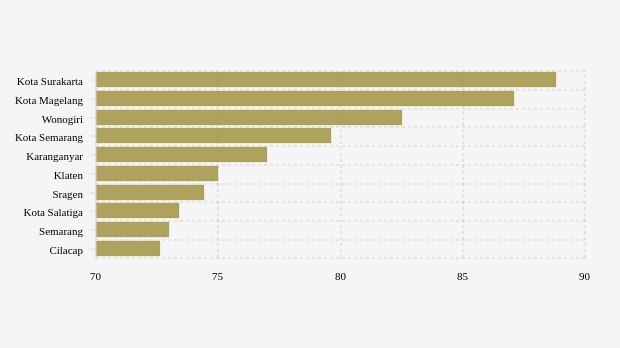 Kota surakarta berada di urutan pertama dengan cakupan vaksinasi lansia sesuai identitas KTP tertinggi sebesar 88,75 persen. Kondisi cakupan vaksinasi lansia sesuai identitas KTP di kota ini terlihat lebih baik dibandingkan pekan sebelumnya yang tercatat 88,65 persen.