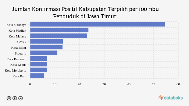Jumlah penambahan konfirmasi positif Covid-19 di Jawa Timur saat ini paling tinggi terjadi di kota Surabaya dengan jumlah 54,68 kasus per 100 ribu penduduk per minggu pada Senin, 8 Agustus 2022. Angka ini lebih tinggi hingga dua kali lipat dibandingkan catatan kasus di wilayah lain yang berada di urutan kedua.
