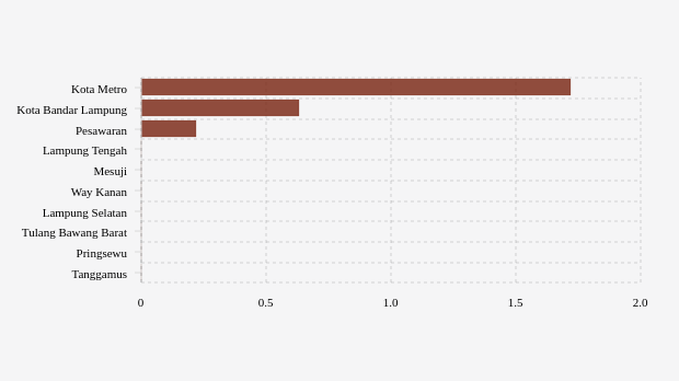 Berikutnya di posisi kedua adalah kota Bandar Lampung. kota ini mencatatkan angka konfirmasi mingguan 0,63 kasus per 100 ribu penduduk. Dibandingkan pekan lalu, jumlah terkonfirmasi Covid-19 pekan ini masih lebih tinggi yang artinya belum terlihat ada perbaikan.