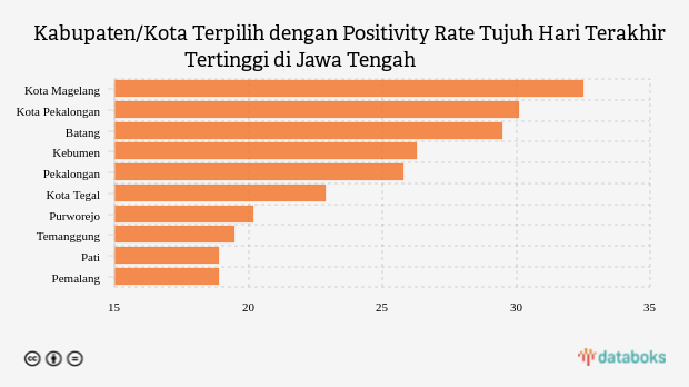 Kondisi yang sama terjadi di kota Pekalongan yang mencatatkan positivity rate tujuh hari terakhir sebesar 30,08 persen. Di kota ini, positivity rate tujuh hari terakhir juga terlihat lebih tinggi dibandingkan pekan sebelumnya yang baru 20 persen. Di urutan berikutnya Batang. Kota di provinsi Jawa Tengah ini mencatatkan positivity rate tujuh hari terakhir sebesar 29,46 persen
