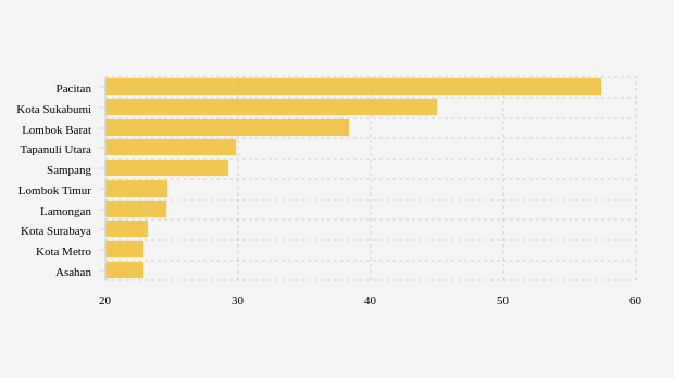 tracing lima kabupaten/kota teratas dengan angka lebih dari 29,3 persen, yaitu Pacitan, kota Sukabumi, Lombok Barat, Tapanuli Utara dan Sampang dengan masing-masing nilai 57,41 persen, 44,95 persen, 38,41 persen, 29,78 persen dan 29,3 persen.