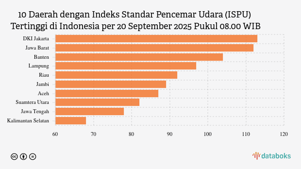 Berikut daftar 10 provinsi dengan indeks kualitas udara terburuk di Indonesia pada Sabtu, 20 September 2025 pukul 08.00 WIB.