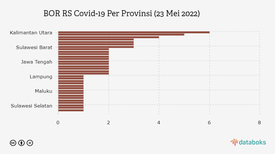 Jika dilihat per provinsi, BOR RS Covid-19 Kalimantan Utara merupakan yang tertinggi dengan tingkat keterisian 6%. Meski demikian, persentase BOR ini masih berada jauh di bawah standar Organisasi Kesehatan Dunia (WHO), yakni sebesar 60%.