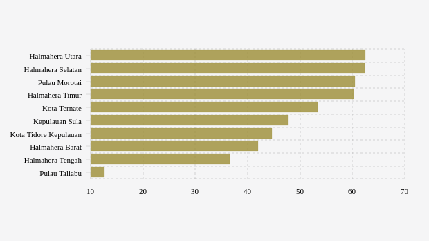 Halmahera utara adalah kabupaten di urutan pertama dengan cakupan vaksinasi lengkap sesuai KTP tertinggi sebesar 62,53 persen. Kondisi cakupan vaksinasi lengkap sesuai KTP di kabupaten ini terlihat lebih baik dibandingkan pekan sebelumnya yang tercatat 62,43 persen.