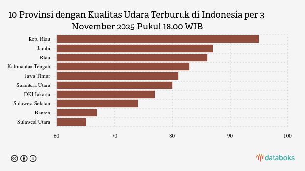 Berikut daftar 10 provinsi dengan indeks kualitas udara terburuk di Indonesia pada Senin, 3 November 2025 pukul 18.00 WIB.