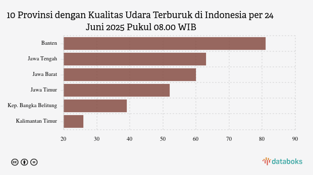 Kualitas Udara di Banten pagi ini terburuk di Indonesia. Berdasarkan halaman Indeks Standar Pencemar Udara (ISPU) Kementerian Lingkungan Hidup dan Kehutanan (KLHK) pada Selasa (24/6/2025) pukul 08.00 WIB terungkap bahwa indeks kualitas udara di Banten sebesar 81.
