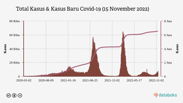 Pasien positif Covid-19 bertambah 7.893 orang per 15 November 2022. Dengan tambahan tersebut, saat ini total kasus Covid-19 di Indonesia telah mencapai 6.573.805.