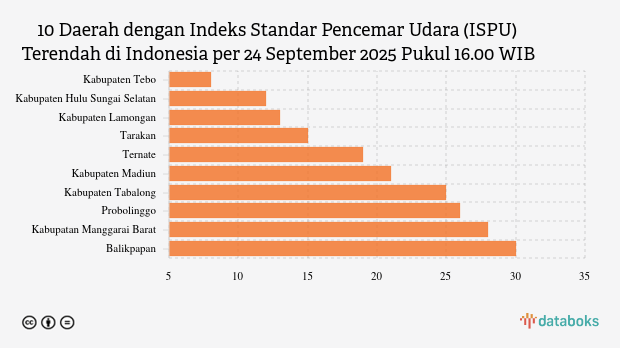 Berikut ini daftar 10 kota dengan kualitas udara paling bersih di Indonesia menurut KLHK pada Rabu, 24 September 2025 pukul 16.00 WIB.