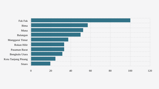BOR khusus Covid-19 lima kabupaten/kota teratas dengan angka lebih dari 37,5 persen, yaitu Fak Fak, Bima, Muna, Balangan dan Manggarai Timur dengan masing-masing nilai 100 persen, 57,14 persen, 52,5 persen, 50 persen dan 37,5 persen.