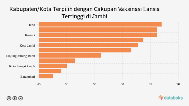 Kondisi yang sama terjadi di Sarolangun yang mencatatkan cakupan vaksinasi lansia sebesar 66,13 persen. Di kabupaten ini, cakupan vaksinasi lansia juga terlihat lebih tinggi dibandingkan pekan sebelumnya yang baru 65,97 persen. Di urutan berikutnya Kerinci. Kabupaten di provinsi Jambi ini mencatatkan cakupan vaksinasi lansia sebesar 66,06 persen