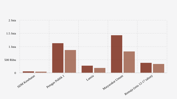 Vaksinasi ke petugas publik dengan target 338,39 ribu jiwa. Vaksinasi dosis 1 dilaporkan telah mencapai 1,13 juta jiwa (333,5 persen target) dan dosis 2 dengan capaian 256,48 persen atau berhasil tersalurkan sebanyak 867,91 ribu jiwa.