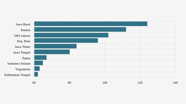 Di bawah Jawa Barat, ada Banten yang menempati posisi kedua terburuk di Indonesia dengan indeks kualitas udara 112. Kemudian, di posisi ketiga ada DKI Jakarta dengan indeks kualitas udara 102.