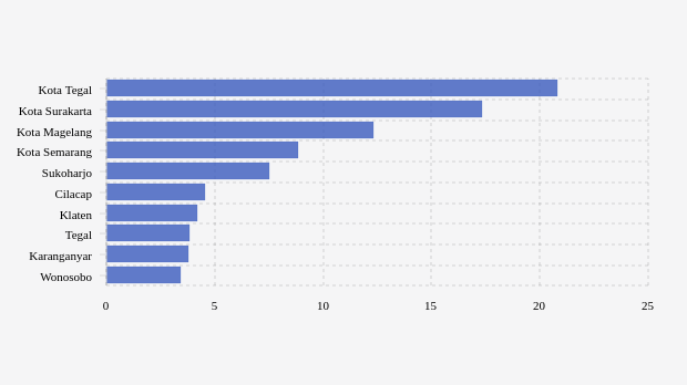 Jumlah penambahan konfirmasi positif Covid-19 di Jawa Tengah saat ini paling tinggi terjadi di kota Tegal dengan jumlah 20,79 kasus per 100 ribu penduduk per minggu pada Sabtu, 27 Agustus 2022. Angka ini selisih tiga kasus dibandingkan catatan kasus di wilayah lain yang berada di urutan kedua.