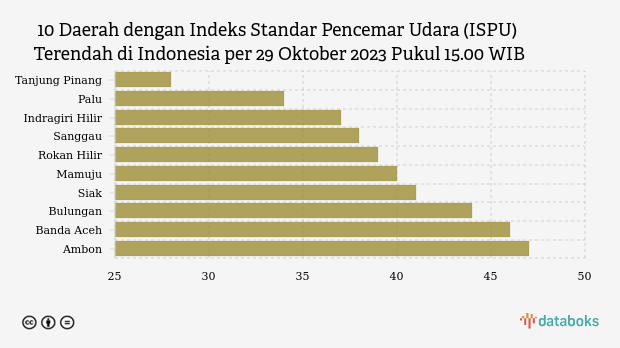 Pemerintah Indonesia menetapkan 10 kota dengan kualitas udara paling bersih di Indonesia pada Minggu (29/10) pukul 15.00 WIB.
