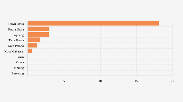Luwu utara adalah kabupaten di urutan pertama dengan BOR tertinggi sebesar 18,1 persen. Kondisi BOR di kabupaten ini terlihat belum membaik karena terjadi peningkatan dibandingkan pekan sebelumnya yang tercatat 10,39 persen.