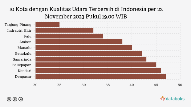 Daftar kota-kota dengan kualitas udara paling bersih di Indonesia menurut Kementerian Lingkungan Hidup dan Kehutanan (KLHK) pada Rabu (22/11) malam ini.