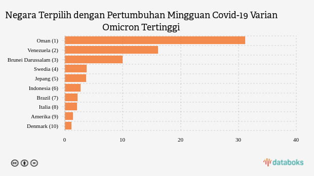 Kemudian, penambahan kasus Omicron di Brunei Darussalam naik 10 persen menjadi 3.794 kasus dibandingkan pekan sebelumnya, penambahan kasus Omicron di Swedia naik 3,79 persen menjadi 82.628 kasus dibandingkan pekan sebelumnya dan penambahan kasus Omicron di Jepang naik 3,74 persen menjadi 300,06 ribu kasus dibandingkan pekan sebelumnya