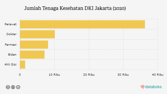 Badan Pusat Statistik (BPS) mencatat, DKI Jakarta memiliki 63.098 tenaga kesehatan pada 2020. Tenaga kesehatan dengan jumlah tebanyak adalah perawat dengan jumlah 36,2 ribu orang.