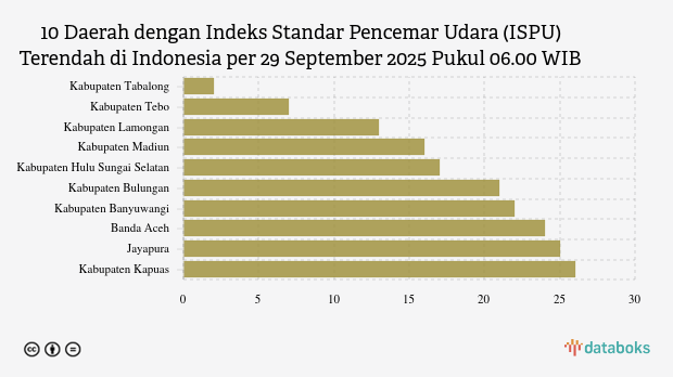 Kualitas udara Kabupaten Tabalong pagi ini paling bersih di Indonesia. Berdasarkan indeks kualitas udara versi Kementerian Lingkungan Hidup dan Kehutanan (KLHK), Kabupaten Tabalong memiliki skor 2 pada Senin (29/9/2025) pukul 06.00 WIB.