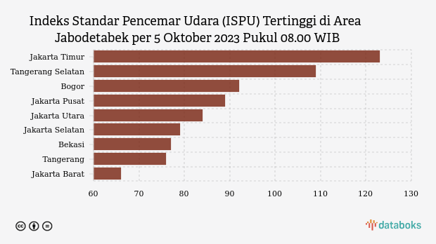 Kualitas udara Jakarta Timur pagi ini terburuk di Jabodetabek berdasarkan data Indeks Standar Pencemar Udara (ISPU) KLHK. Adapun indeks kualitas udara Jakarta Timur tercatat 123 pada Kamis (5/10/2023) pukul 08.00 WIB.
