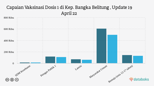 Cakupan vaksinasi dosis 1 di provinsi Kep. Bangka Belitung, hari ini Selasa, 19 April 2022, telah mencapai 95,99 persen. Angka ini setara dengan 1,09 juta peserta vaksin dari target yang ditetapkan sebanyak 1,14 juta orang. Sementara untuk vaksinasi dosis 2 hingga kemarin telah tercapai 81,17 persen dari target.