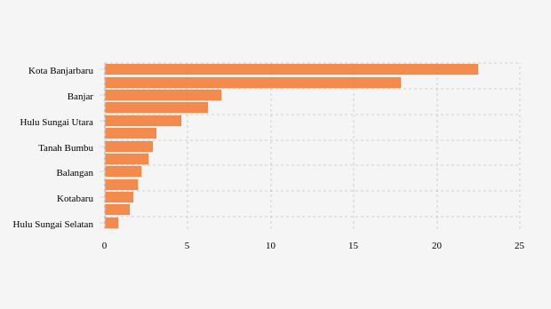 Kota banjarbaru berada di urutan pertama dengan jumlah konfirmasi positif covid-19 mingguan terbanyak sebesar 22,49 jiwa per 100 ribu penduduk/minggu. Kondisi jumlah konfirmasi positif covid-19 mingguan di kota ini terlihat belum membaik karena terjadi peningkatan dibandingkan pekan sebelumnya yang tercatat 12,14 jiwa per 100 ribu penduduk/minggu.