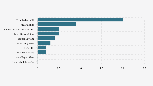 Kota prabumulih berada di urutan pertama dengan jumlah konfirmasi aglomerasi positif covid-19 mingguan terbanyak sebesar 2,01 jiwa per 100 ribu penduduk/minggu. Kondisi jumlah konfirmasi aglomerasi positif covid-19 mingguan di kota ini terlihat belum membaik karena terjadi peningkatan dibandingkan pekan sebelumnya yang tercatat 0,5 jiwa per 100 ribu penduduk/minggu.