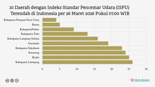 Berikut daftar lengkap 10 kota dengan kualitas udara paling bersih di Indonesia menurut KLHK pada Kamis, 26 Maret 2026 pukul 07.00 WIB.
