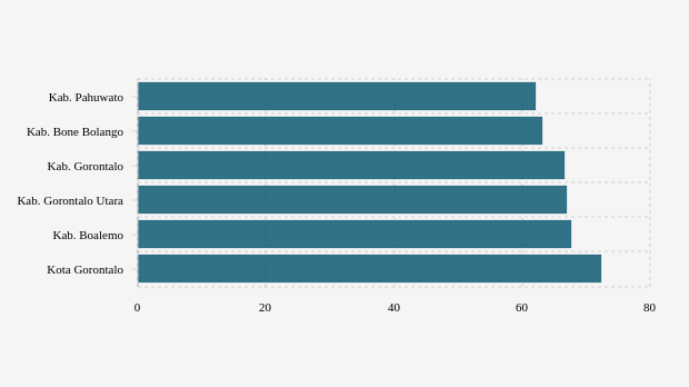 Yang lainnya adalah kabupaten Gorontalo di urutan ketiga. Dengan sasaran vaksin sebanyak 316,7 ribu peserta, untuk dosis 2 telah berhasil direalisasikan 66,58 persen atau 210,87 ribu peserta. Menurut data Kementerian Kesehatan, rerata vaksinasi minggu lalu di Gorontalo tercatat 1.305 peserta. Jumlah stok vaksin yang tersisa saat ini tercatat 68.198 dosis.