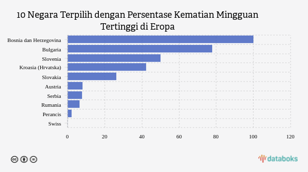 Bosnia dan Herzegovina berada di urutan pertama dengan penambahan kematian per minggu tumbuh 100 persen. Di negara ini, Worldmeter mencatat jumlah kematian sebanyak enam jiwa naik 20 persen dibandingkan hari sebelumnya.