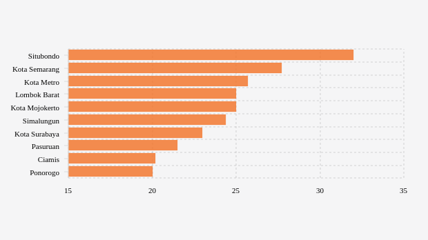 tracing lima kabupaten/kota teratas dengan angka lebih dari 25 persen, yaitu Situbondo, kota Semarang, kota Metro, Lombok Barat dan kota Mojokerto dengan masing-masing nilai 32 persen, 27,67 persen, 25,67 persen, 25 persen dan 25 persen.