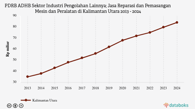 Badan Pusat Statistik (BPS) mencatat PDRB ADHB Sektor Industri Pengolahan Lainnya; Jasa Reparasi dan Pemasangan Mesin dan Peralatan di Kalimantan Utara pada tahun 2024 mencapai Rp 84,18 miliar. Data historis menunjukkan pertumbuhan positif selama periode 2013-2024. Nilai tertinggi tercatat pada tahun 2024 dengan Rp 84,18 miliar, meningkat dibandingkan tahun sebelumnya.