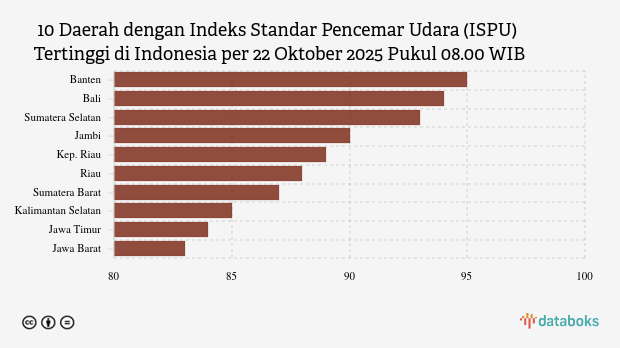 Berikut daftar 10 provinsi dengan indeks kualitas udara terburuk di Indonesia pada Rabu, 22 Oktober 2025 pukul 08.00 WIB.