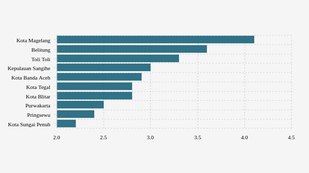Penggunaan rawat inap lima kabupaten/kota teratas dengan angka lebih dari 2,85 pasien per 100 ribu penduduk/minggu, yaitu kota Magelang, Belitung, Toli Toli, Kepulauan Sangihe dan kota Banda Aceh dengan masing-masing nilai 4,1 pasien per 100 ribu penduduk/minggu, 3,64 pasien per 100 ribu penduduk/minggu, 3,32 pasien per 100 ribu penduduk/minggu, 3,02 pasien per 100 ribu penduduk/minggu dan 2,85 pasien per 100 ribu penduduk/minggu.